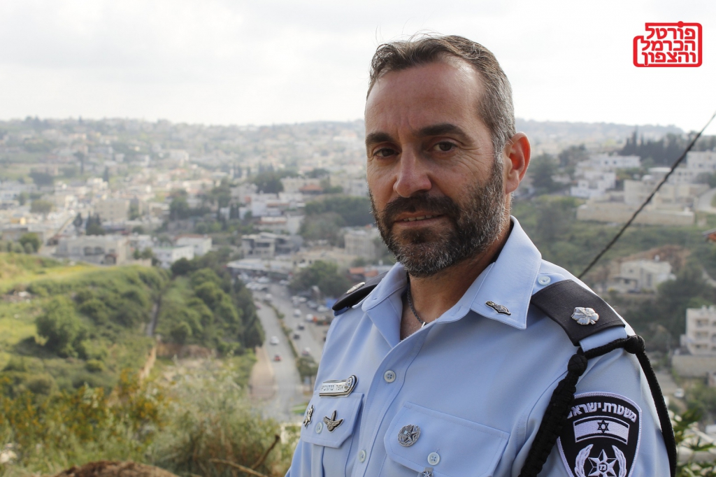 בתמונה מעוספיה ברקע של דאלית אל כרמל, מפקד נקודת משטרת רכס הכרמל הנכנס רפ"ק אופיר ברקוביץ, שמגיע עם הרבה תכניות ובעיקר הקשר האישי בין המשטרה לחברה המקומית.