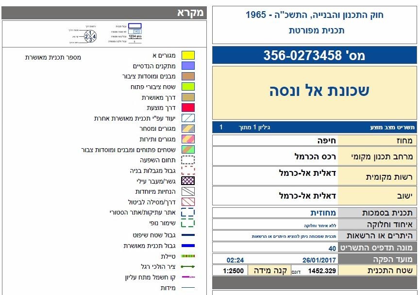 מרחב תכנון מקומי רכס הכרמל: 356-0273458 : שכונת אל ונסה דיון בהתאם סעיף 106ב לחוק המשך דיון יזם התכנית: דאלית אל כרמל. משרד השיכון והבינוי, עורך התכנית:אדריכל נזיה ח'ורי.מטרת התכנית:להסדיר בניה קיימת בשכונה, ובמקביל להעמיד שטחים לפיתוח מגורים, דרכים, שטחים ציבורים על בסיס תכנון מקדים מכוון ומשתלב עם הבניה הקיימת.