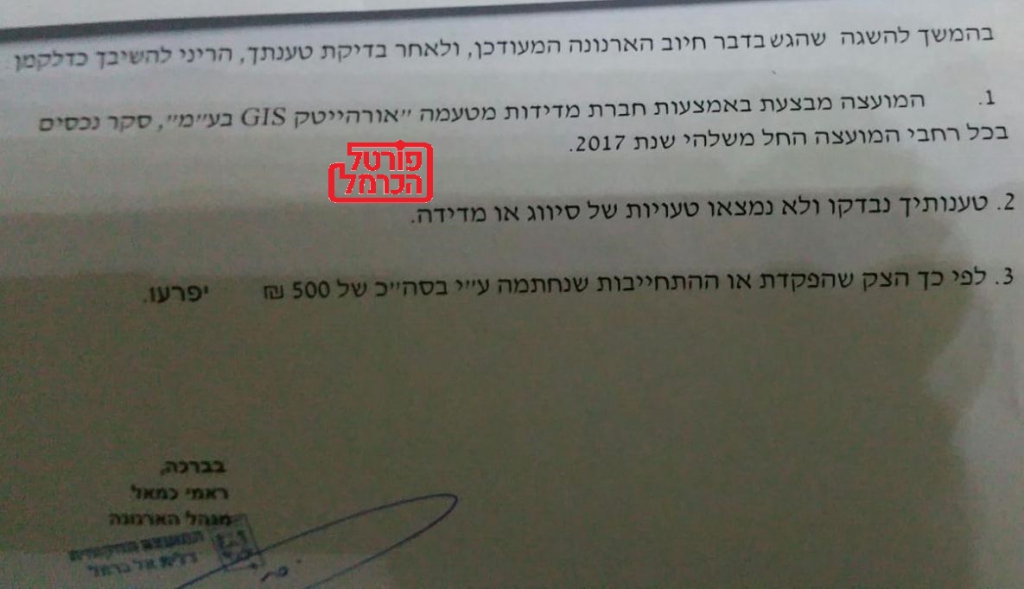 לפניכם מסמך שחתום עליו פקיד הגביה רמי כמאל ובו מודיע לאזרח תושב דאלית אל כרמל, שלאחר שהערעור שלו נבדק לא נמצא צודק, ושההמחאה שהתושב הפקיד תיפרע.
