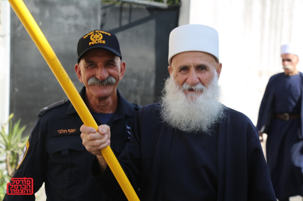 תמונה של שוטר מתנדב בחברה מדאלית אל כרמל יוסף בדר חלבי, יחד עם שייך אבו שמחה זוהדי עיסמי, איש שפעיל מאד בחברה בנושא מאבק האדמות.