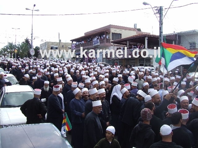 תמונת ארכיון משנת 2007, של דרוזים מכפרי הגליל והגולן, שצעדו בצעדת קירוב הלבבות בכפר דאליית אל כרמל, זה היה מנהג שהיה מתקיים כל פעם בכפר אחר, שבמסגרתו אנשי הדת והחילוניים הדרוזים שמרו על קשר הדוק ויחסי כבוד הדדי.