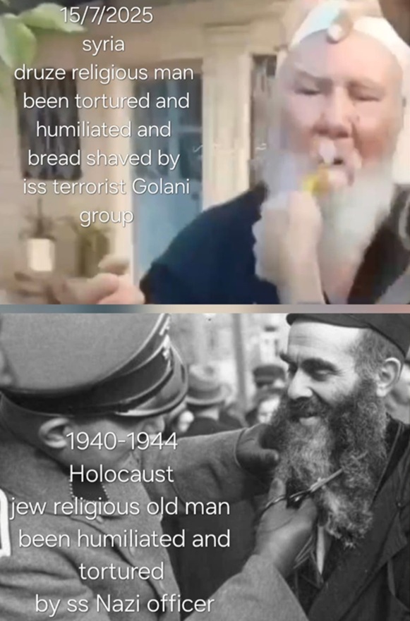 תושב שפרעם שולח תמונה ומביא השוואה, בתמונה למעלה ב-2025 טרוריסט מארגון אל-ג'ולאני מתעלל באכזריות באיש דת דרוזי, רק בגלל היותו דרוזי. בתמונה למטה קצין אס.אס נאצי משפיל חכם דת יהודי בתקופת השואה, רק בגלל היותו יהודי.