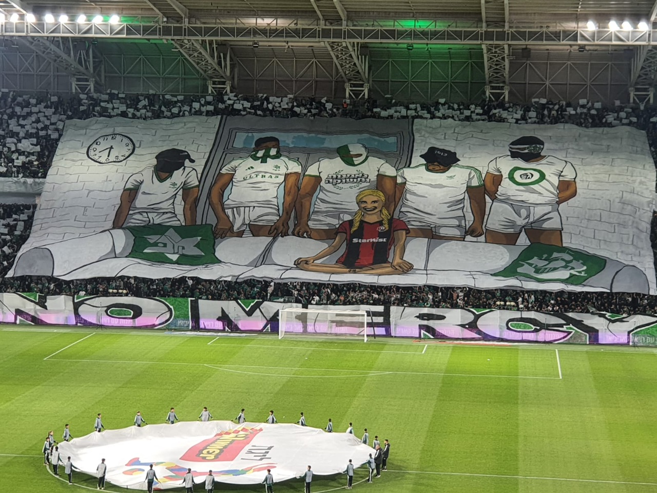 במשחק דרבי בכדורגל בליגת העל בין מכבי להפועל חיפה, שהתקיים באצטדיון סמי עופר, ביציע אוהדי מכבי חיפה הונף שלט ענק בו צויין המשפט אין רחמים הפרוש לז.. את הפועל חיפה, בו מצולמת שחקנית פורנו, השלט עורר מהומה, יש כוונה להגיש תלונה בנדון.