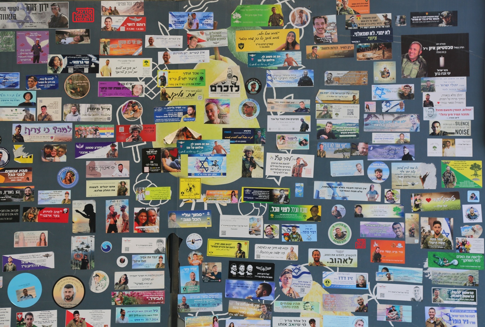מאז 7 באוקטובר 2023 הצברו מדבקות של לוחמי צה"ל שנפלו במלחמה בעזה לבנון איו"ש וסוריה, התמונה באלונית מדברת על קיר הנצחה של אנשים יפים שעזבו אותנו מוקדם, תרומתם הייתה ותשאר לעד.