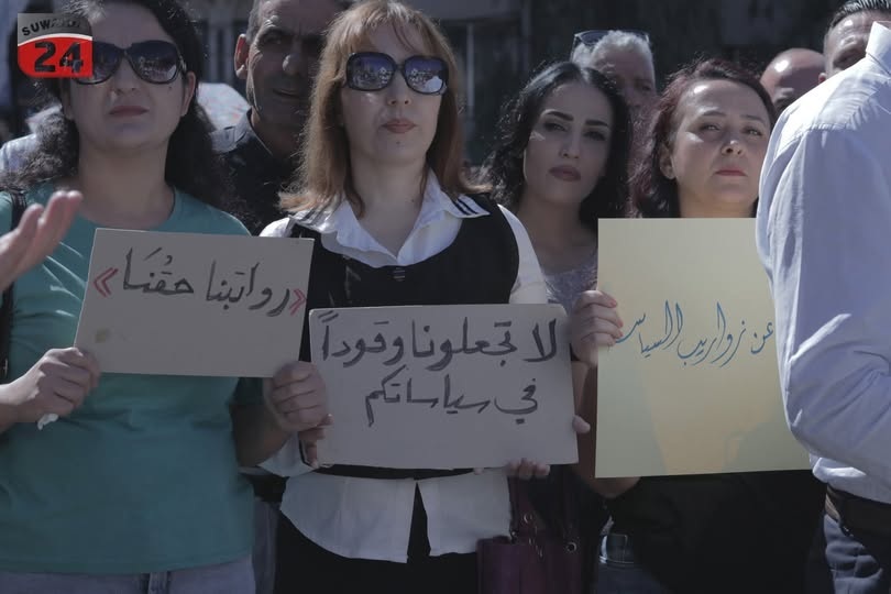 תמונות ממחאות של נשים דרוזיות סוריות, שנקלעו למשבר כלכלי בעקבות התנהגות הממשל הסורי של אלג'ולאני עם הדרוזים במחוז סווידא, הן צועקות לעולם הצילו ותעזרו, כדי שנוכל לחיות במדינתנו.