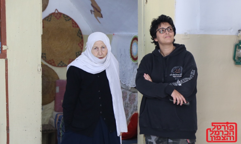 תמונה של הצעירה חלא חלבי סטודנטית תושבת דאלית אל כרמל יחד עם וופיקה חיר מאדי, תושבת ג'וליס, שיחה מרתקת בין הדור הצעיר לדור גיל הזהב, לומדים אחת מהשניה.