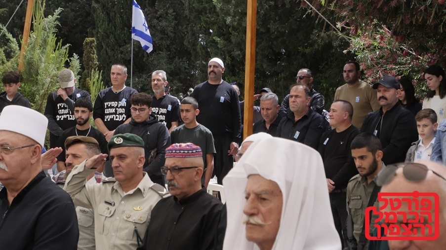 תמונה שצולמה ביום הזיכרון 2024 בבית הקברות הצבאי בעוספיה, בתמונה עומדים מספר אנשים עם חולצות מחאה שנכתב עליהן "חוק קמיניץ הפך אותנו לעבריינים", במטרה להמחיש את מצב הצעירים בכפרים הדרוזים שלא יכולים לבנות באדמות שלהם.