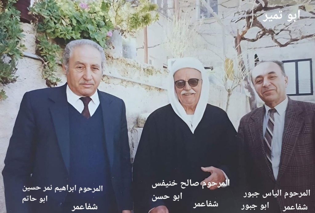 תמונה ששלח למערכת אמין נסר אלדין שבה מופיעים, מנהיגים שבלטו בעיר שפרעם, אליאס גבור ז"ל, שייח' סאלח חניפס ז"ל, אברהים נמר חסין ז"ל.