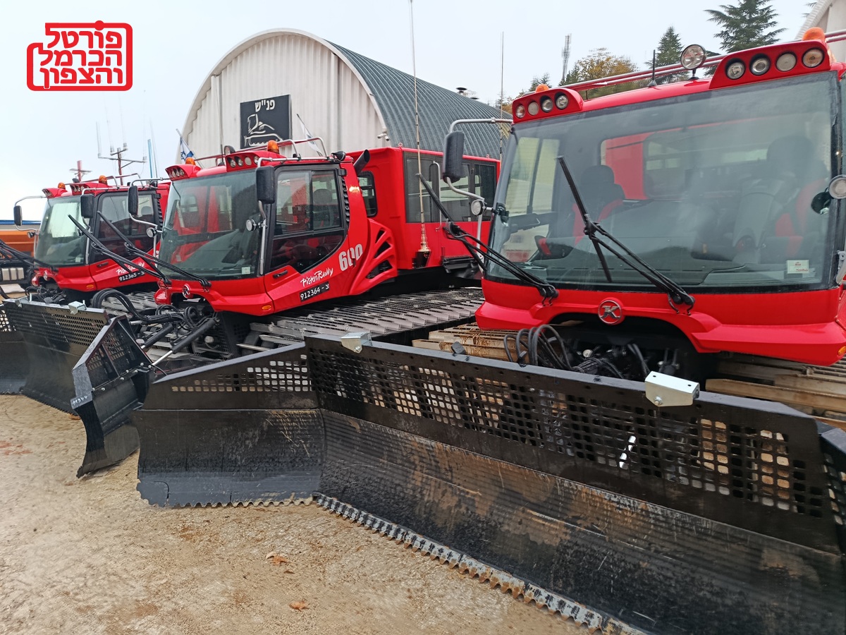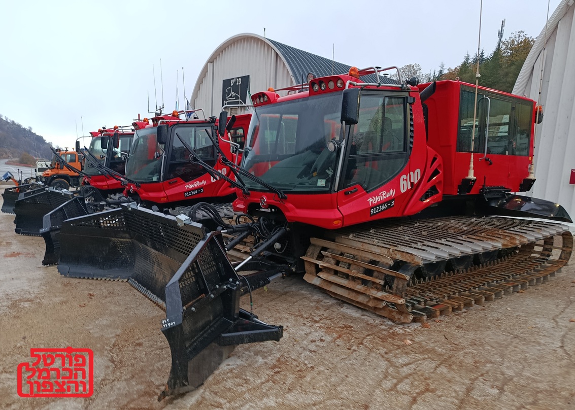 תמונה של מפלסות השלג הגדולות שמוכנות להיערמות שלג בכבישי הגולן והחרמון, תפקידם לפלס את הדרכים ולאפשר גישה בטוחה לכל מי שמשתמש בדרך, השבוע הם מאוד חיוניות בראש ההר.