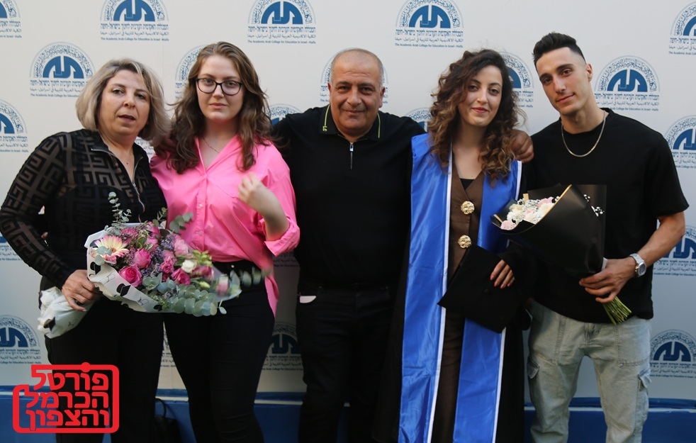 תמונה של משפחה ממגדל שמס ברמת הגולן, שמלווים את הבת ביום קבלת תואר אקדמי בחינוך, התמונה צולמה בחיפה במכללה הערבית לחינוך, משפחה תומכת ומאושרת בשמחת הבת.