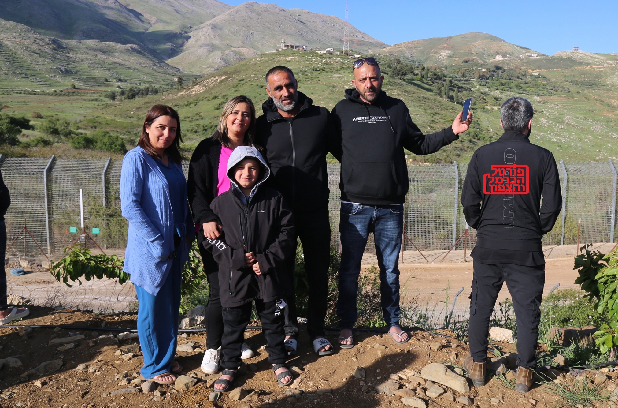 תמונה משפחתית של עודד ועביר ורום אבו חמדה, גני ורימונדה אמון, תושבי כפר ירכא, אשר הגיעו לגבול סוריה ישראל, הגובל למג'דל שמס, כדי להיפרד מהשיירה הארוכה של המבקרים הדרוזים הסורים שביקרו בקבר יתרו עה"ש, תמונה שברקע השטח הסורי.