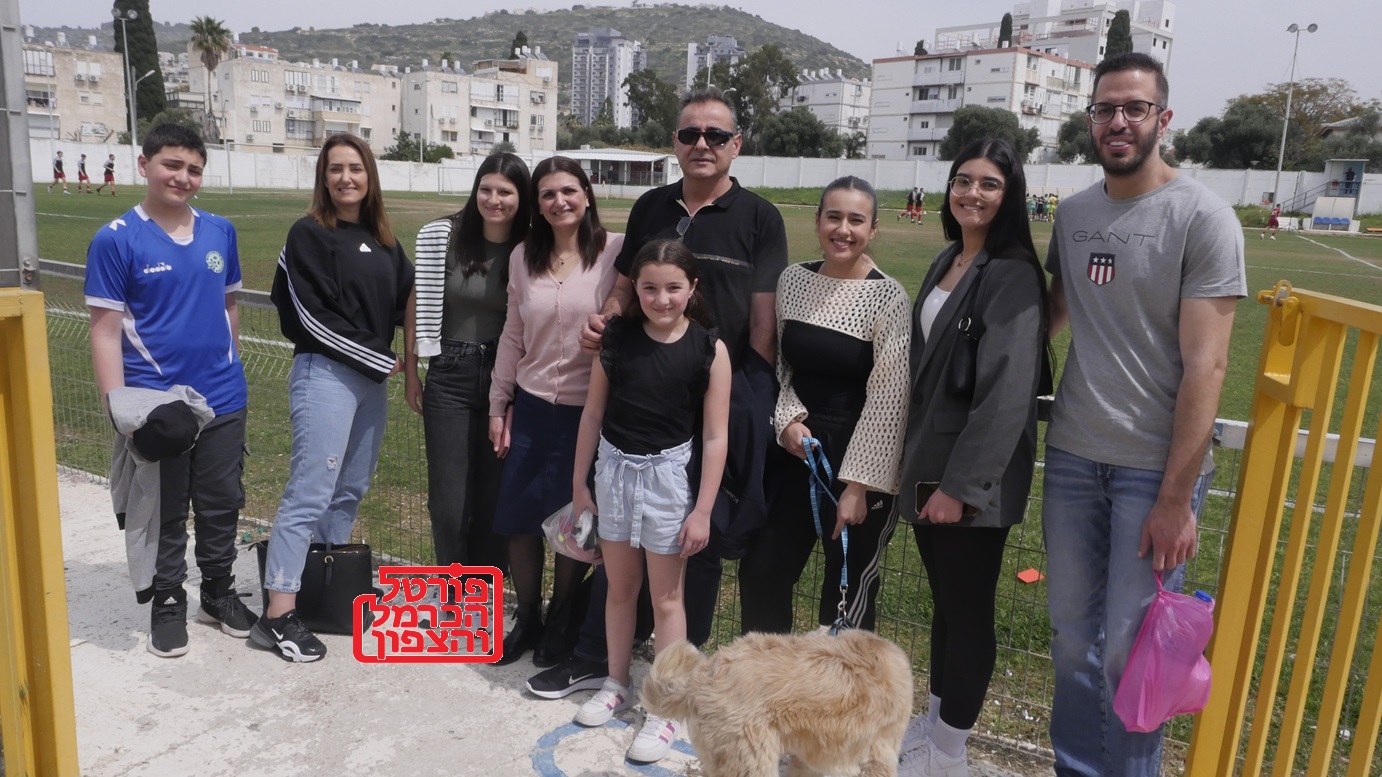 תמונה של סולטאן מקלדה ובני משפחתו שהגיעו למגרש הכדורגל לעודד את בנם אדיר שוער הנוער של מכבי עוספיה , בתמונה, סולטאן, מהא, רזאן והדיל מקלדה, אן נטור, ויסאם חלבי, חסיבה חוסיסי, גומלין עומרי והכלב סושי, חיבור מושלם ומגבש של משפחה גדולה במגרש אחד.