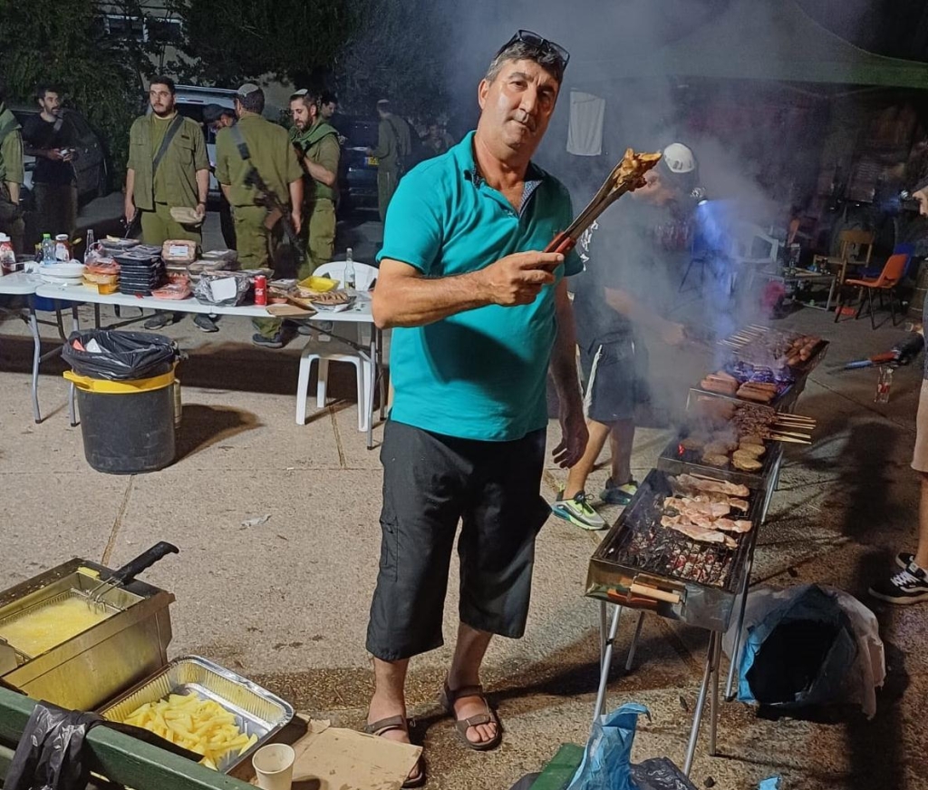 תמונה של סאהר חלבי (בחולצה כחולה), רפתן מתנדב מדאלית אל כרמל, שדאג להאכיל את צוות קיבוץ מפלסים, דודו פאר דובר צוות החירום היישובי כתב לרפיק חלבי "שמחנו לארח אצלנו במפלסים, בעוטף, את הנציג הכי טוב מדאלית אל כרמל, רפתן מתנדב שמפעיל את הרפת שלנו, הוא מייצג את המיטב של דאלית אל כרמל, וכבר עשרה ימים, משמח ומבדר אותנו, נשארנו כאן כ-30 תושבים, אנחנו מודים לך ששלחת את סאהר אלינו".