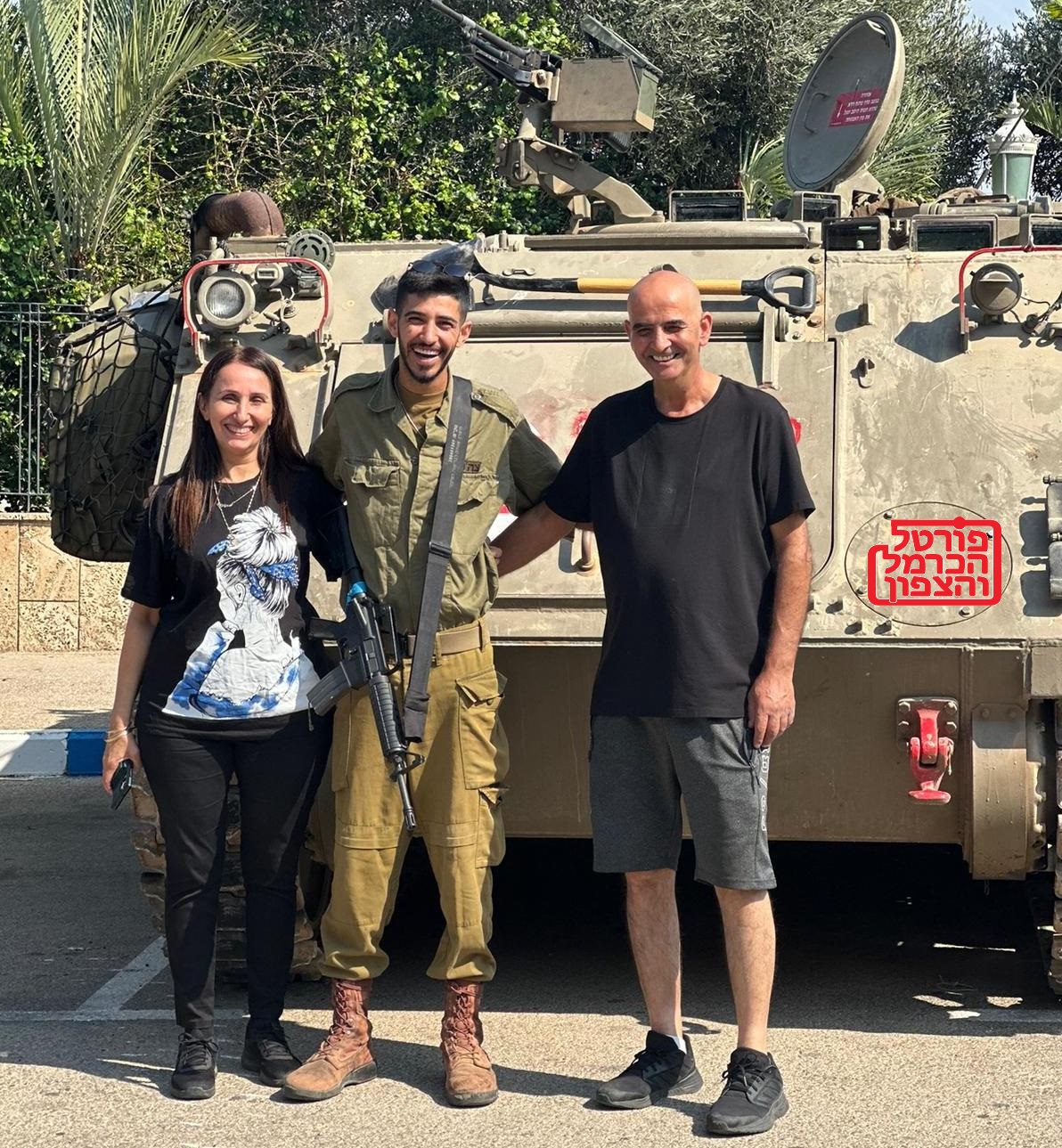 ההורים של חייל המילואים ראני חלבי מדאלית אל כרמל הגיעו קרוב לגבול הדרומי לבקר את הבן שמגוייס למילואים, ראני נמצא בלב הלחימה בעזה, בתמונה סאפי מנהל בכיר ברשת שיווק, ראני חלבי יוצר מוזיקה וגאדה חלבי עובדת רשת מזון מובילה.