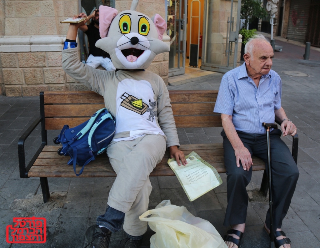 האיש שמחופש לחתול יושב על הספסל ברחוב יפו בירושים ובידו מחזיק שלט, בו נכתב, צילום מודפס עולה כסף, את התמונה צילמנו וגם שילמנו, תמונה מירושלים משקפת חיי חברה שנמצאת במצב כלכלי לא כל כך טוב, לאיש מימין אין קשר לנאמר.