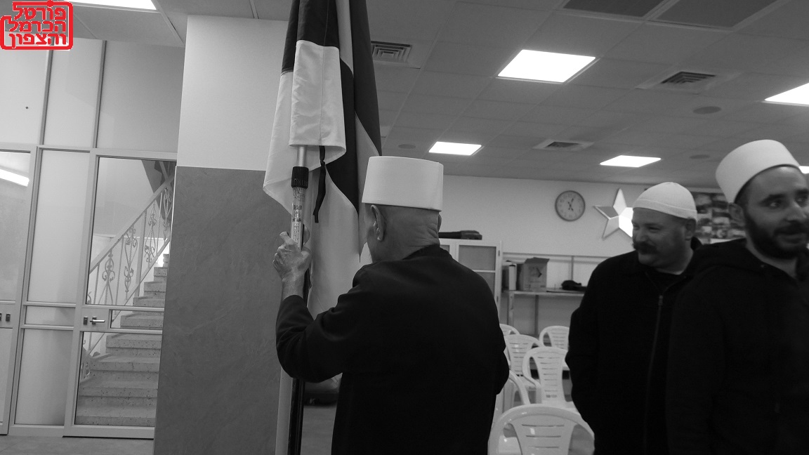 תמונה מיוחדת בשחור לבן של שייך אבו סמחה זוהדי עיסמי תושב דאלית אל כרמל שנקלט במצלמת פורטל הכרמל קושר את דגל הדרוזים במקאם אבו אברהים עה"ש בדליה.