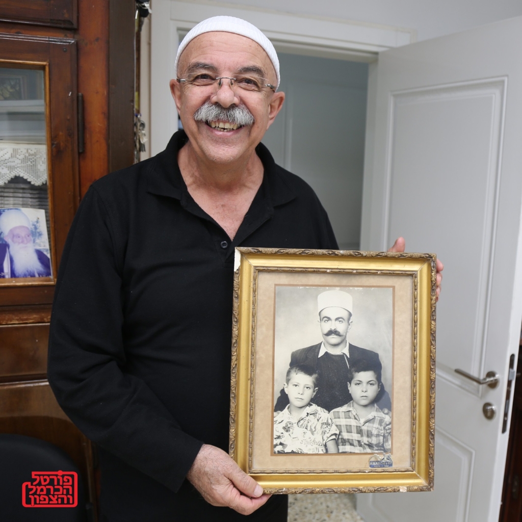 תמונה של המחנך ומנהל בית ספר יסודי א' עוספיה שייך נאיף מנסור, שמחזיק תמונה של אב המשפחה שייך חוסין ז"ל והילדים מאלק וזוהיר, משפחה שמעורבת ותרומתה רבה למען התפתחות הישוב הדרוזי.