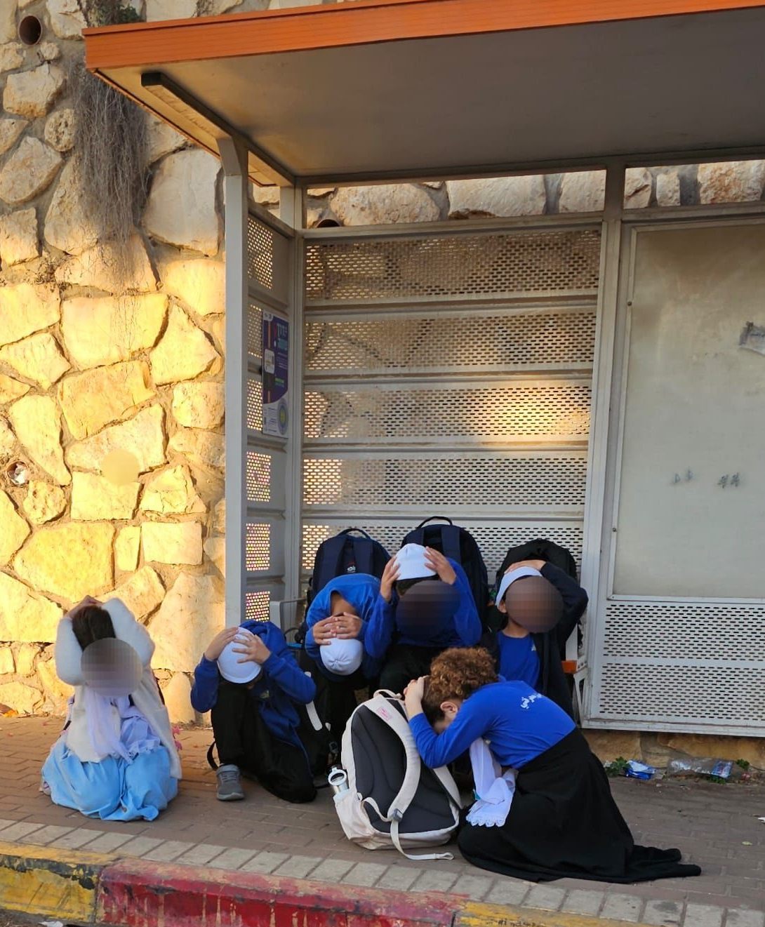 תמונה שממחישה את המצב הביטחוני בישראל, תלמידי דליה עוספיה שנקלעו לירי טילים מלבנון מתגוננים בתוך תחנת אוטובוס בכרמל, להתבונן בתמונה ולחשוב באיזה מצב הילדים נמצאים בתקופה זו.