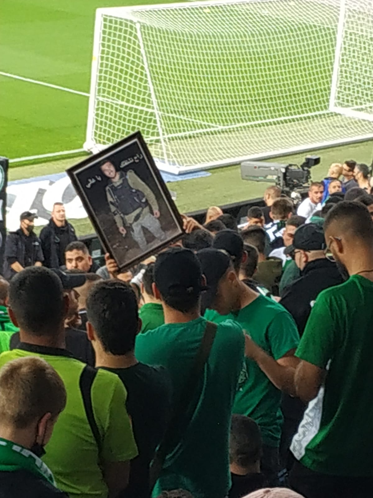 תמונה שמגיעה למערכת של אוהדי מכבי חיפה, שצופים במשחק, כשהם אוחזים בתמונתו של החלל יזן פלאח ז"ל, מכפר סמיע שנרצח בפיגוע ירי בחדרה, תמונה מאד מרגשת.