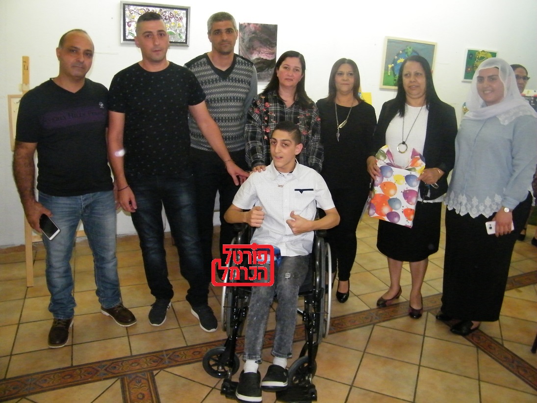 בתמונה עומרי חלבי חולה ה CP שיתוק מוחין שהציג תערוכת אומנות, שהתקיימה במרכז תרבות בדאלית אל כרמל בתאריך 8-5-2018 , התערוכה משכה אנשי ציבור משפחה והורים והצוות החינוכי מדליה וחיפה להגיע לפרגן ולתמוך, עומרי חזק בלייק