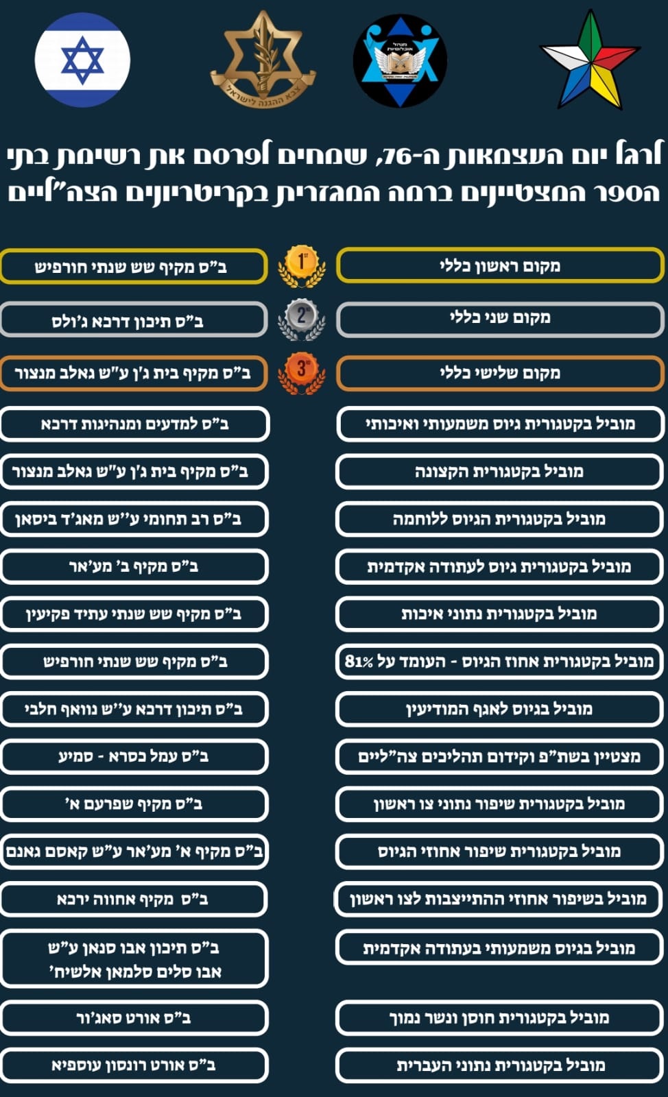 רשימת בתי הספר הדרוזים המצטיינים, מקום ראשון בית ספר מקיף שש שנתי חורפיש, מקום שני בית ספר תיכון דרכא ג'וליס, מקום שלישי בית ספר מקיף בית ג'ן ע"ש גאלב מנצור, מובילים בקטגוריית נתוני איכות בית ספר מקיף שש שנתי עתיד פקיעין, מוביל בגיוס לאגף המודיעין בית ספר תיכון דרכא ע"ש נואף חלבי, מוביל בקטגוריית נתוני העברית בית ספר אורט רונסון עוספיה, מוביל בקטגוריית שיפור נתוני צו ראשון בית ספר מקיף שפרעם א' ועוד.