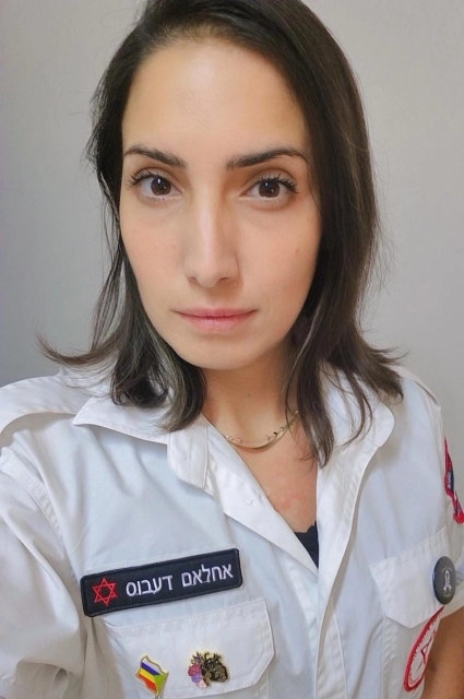 אחלאם דעבוס, אימא לשלושה, תושבת עין קניא, מתנדבת מד"א רמת הגולן, אחלאם הצטרפה להתנדבות במד"א בעקבות המלחמה שהחלה ב-7 באוקטובר 2023, דוניא משתלמת ועולה למשמרות בדרך כלל באמבולנס לבן, יחד עם נהג/ת ובוגר/ת במשמרת.