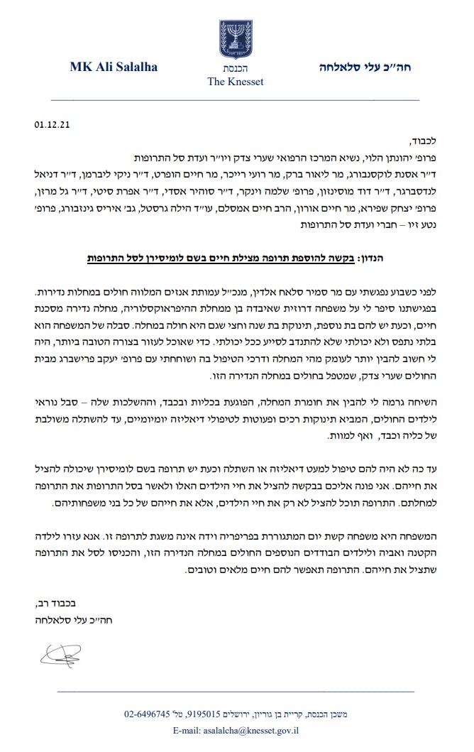 המכתב ששלח ח"כ סלאלחה לחברי ועדת סל התרופות להוספת תרופה מצילת חיים לסל התרופות