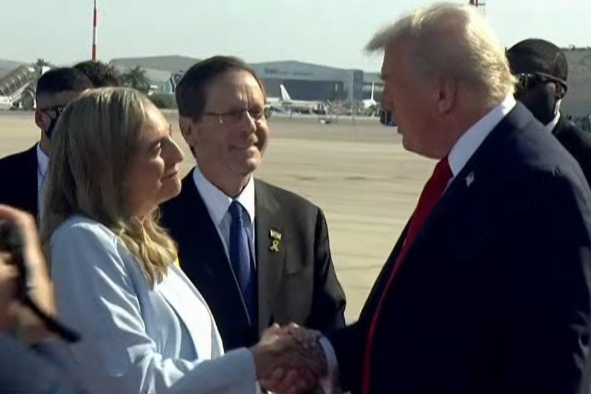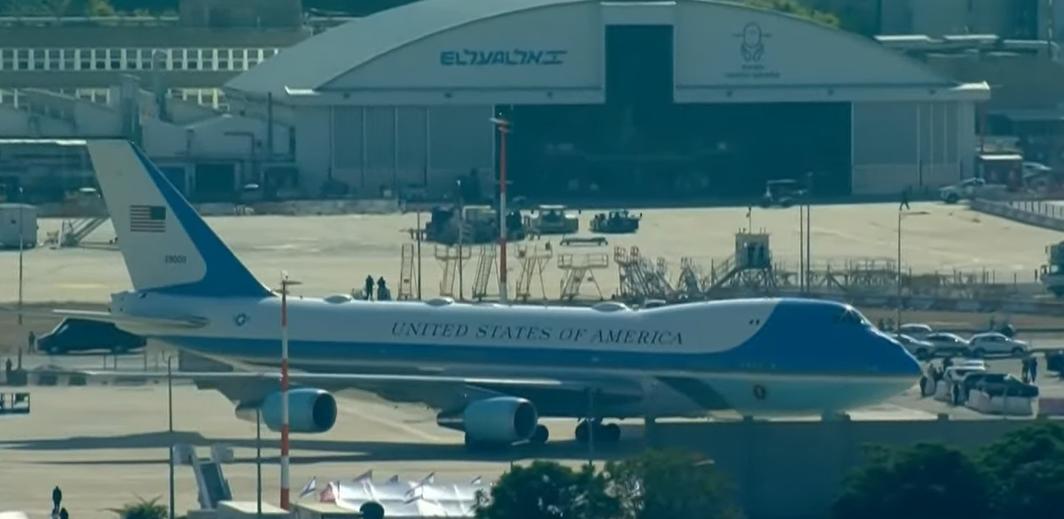 מטוסו של נשיא ארה"ב טראמפ טס מעל ככר החטופים בתל אביב, רגע לפני הנחיתה בשדה התעופה הבינלאומי של ישראל בן גוריון, הבית הלבן שיחרר סרטונים מתוך המטוס שצולמו מעל תל אביב.