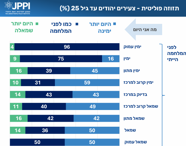 התזוזה ימינה ניכרת גם בקרב צעירים יהודים, כמעט בכל קבוצת הזדהות פוליטית. כמעט מחצית (45%) ממי שאומרים שלפני המלחמה היו מגדירים את עצמם "ימין מתון" ורוב (59%) מי שאומרים שהיו "ימין קרוב למרכז" מעידים כי זזו ימינה על הסקלה הפוליטית.