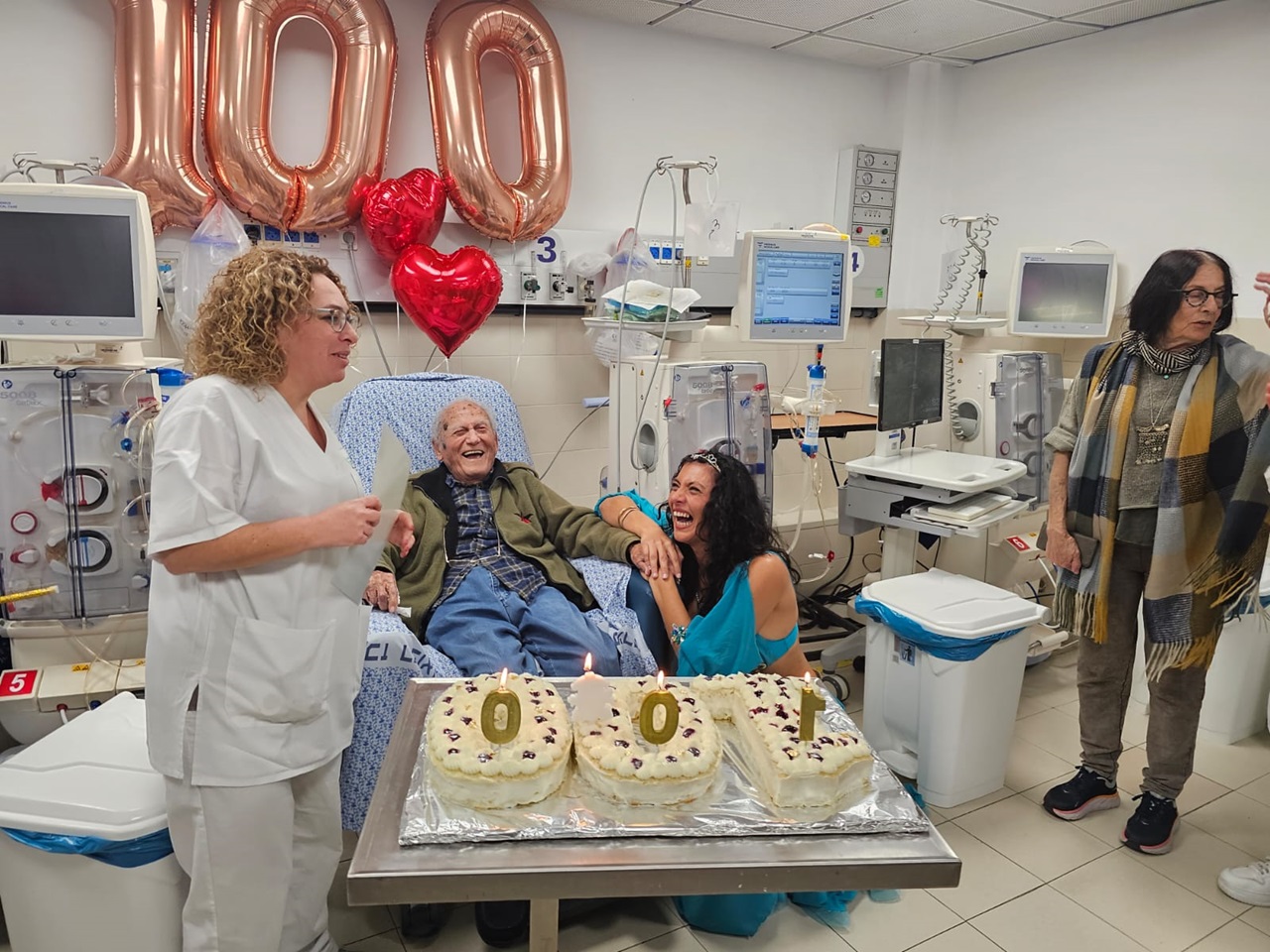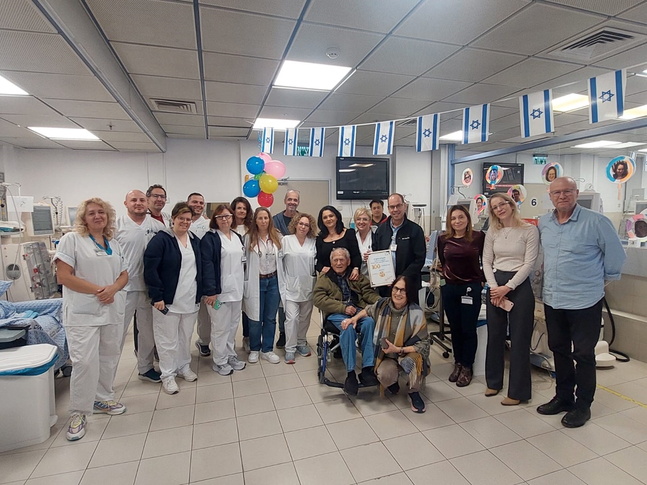 דב אלקנתי שחגג יומולדת 100 עם מנכ"ל המרכז הרפואי בני ציון ד"ר אוהד הוכמן, צוות המכון הנפרולוגי ובני משפחה צילום: קרן כבירי.