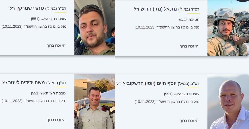 הותר לפרסום שחמישה לוחמי צה"ל מעוצבת חצי האש 551 נהרגו בקרבות בעזה, רס"ר במיל' מתן מאיר ז"ל, רס"ן במיל' משה ידידיה לייטר ז"ל, רס״ם מיל׳ יוסף חיים (יוסי) הרשקוביץ, רס״ר מיל׳ סרגיי שמרקין, רס״ר (מיל’) נתנאל (נתי) הרוש, בנוסף קצין וארבעה לוחמים מגדוד 697, חטיבה 551 נפצעו באורח קשה בעזה.