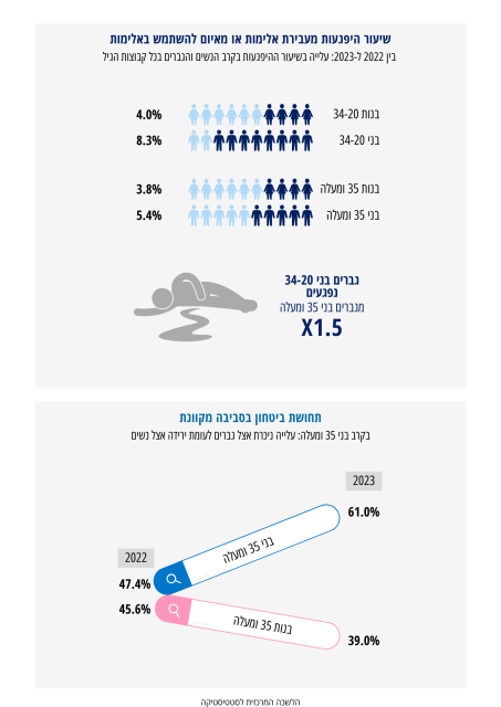 ביטחון אישי, אחוז הנפגעים מאלימות או מאיום באלימות: עלייה מ-3.7% ב-2022 ל-5.1% ב-2023 (האחוז הגבוה ביותר מאז 2015)