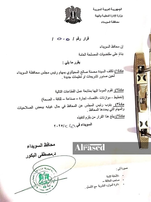 בימים קשים אלה שעוברים על הדרוזים בסוריה, מינה מושל מחוז סווידה את גברת מחסנה סאלח מחיתאווי לתפקיד ממלא מקום ראש מועצת סווידה, על פי מקורות בתקשורת הערבית הסורית, ההחלטה הועברה חתומה בחתימתו של מושל מחוז סווידה ד"ר מוסטפה באקור.