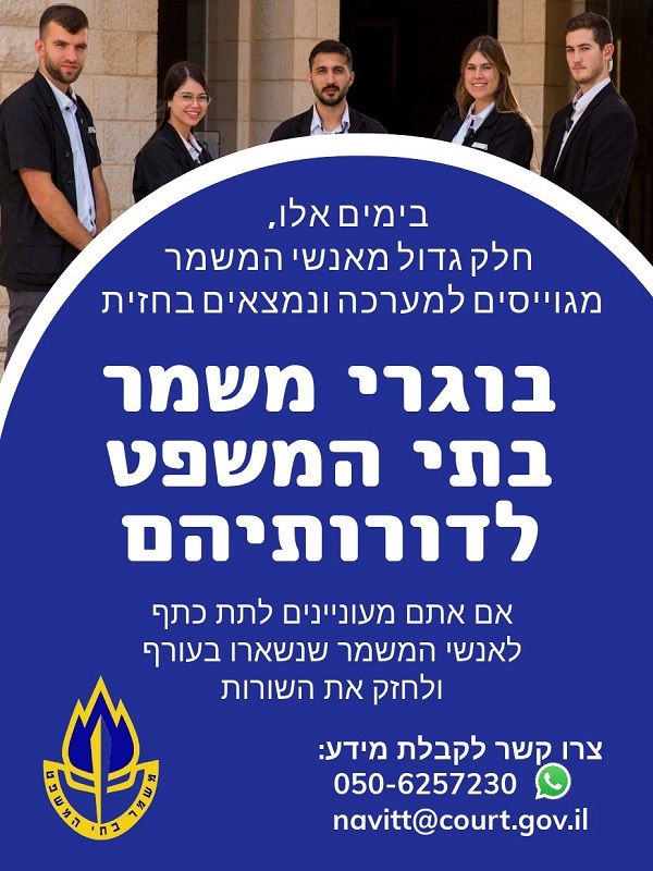 בוגרי משמר בתי המשפט לדורותיהם, המעוניינים בימים אלו לחזק את שורות משמר בתי המשפט לפניכם פרטי יצירת קשר לקבלת מידע נוסף.