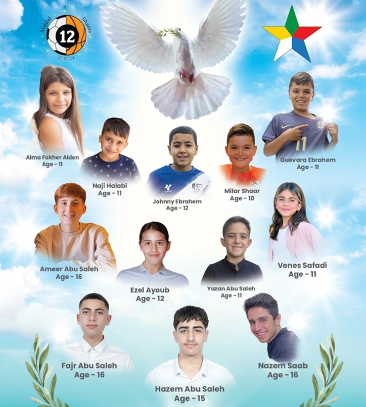 שנה חלפה מאז הטבח במגרש במג'דל שמס, בו נהרגו הילדים: אלמא איימן פחראלדין, מילאד מועדאד אלשעאר, ויניס אדהם ספדי, איזיל נשאת איוב, יזן נאיף אבו סאלח, גוני ודיע אברהים, אמיר רביע אבו סאלח, נאגי טאהר אלחלבי, פגר ליית' אבו סאלח, חאזם אכרם אבו סאלח, נאזם פאחר סעב, גיווארה אברהים. זכרונם לברכה.