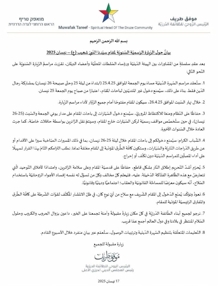 איבוד שליטה על חלק מהמבקרים שהשתמשו בנשק חם וירי לשם שמחה בביקור של התושבים הסורים בישראל לפני חודש, ככל הנראה הביא להחלטה של ההנהגה הדתית הדרוזית בראשות שייך מוופאק טריף, הודעה לציבור בשמו ובשם הרשויות וחברי הכנסת שביום החג 25-4-2025 יום שישי רק דתיים יורשו לשהות במתחם, כל החילוניים לא, מן הראוי היה לחשוב על ההחלטה לפני, השלכות ההודעה פוגעות בציבור רחב והפגיעה קשה ובעיקר מרחיקה בין הציבור הדרוזי הדתי לציבור החילוני.