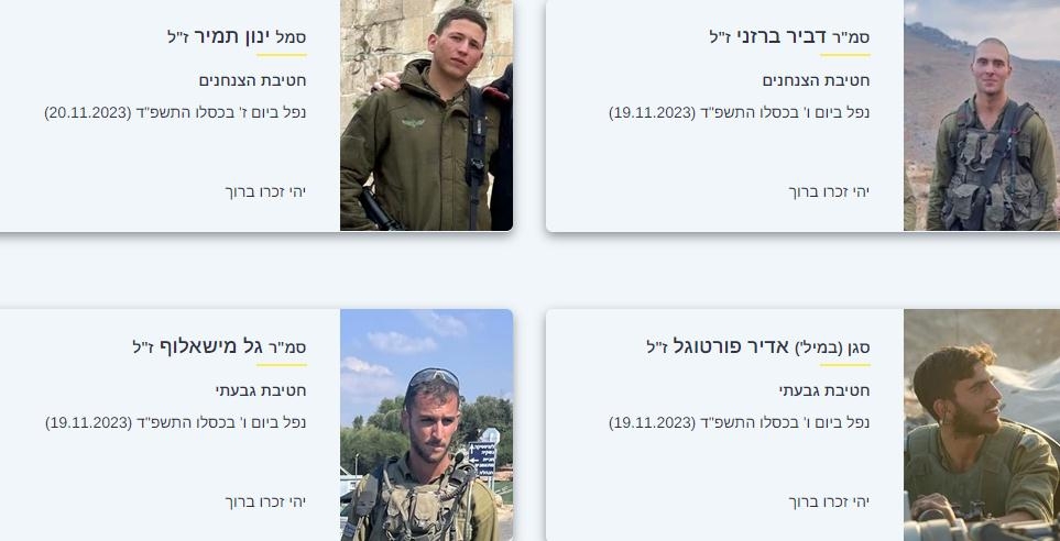 סגן (במיל') אדיר פורטוגל, ממזכרת בתיה, קצין בגדוד שקד, חטיבת גבעתי, בן 23 בנופלו. סמ"ר גל מישאלוף, ממודיען, לוחם בגדוד צבר, חטיבת גבעתי, בן 21 בנופלו. סמ"ר דביר ברזני, מירושלים, לוחם בגדוד 890, חטיבת הצנחנים, בן 20 בנופלו. סמל ינון תמיר, מפרדס חנה-כרכור, לוחם בגדוד 890, חטיבת הצנחנים, בן 20 בנופלו.
