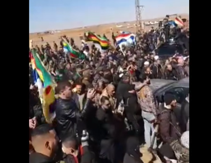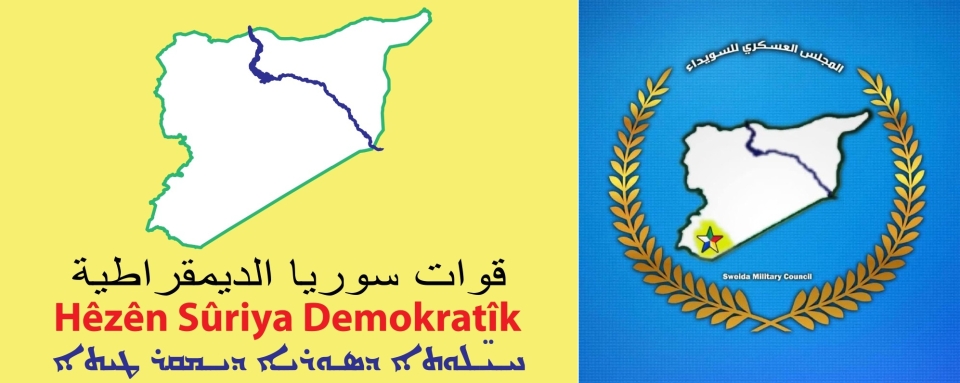 במפה מימין הדגל המופץ ע"י כוחות חירות דרוזים המוטמע בו כוכב הצבעים של דגל העדה הדרוזית. ומשמאל דגל הכורדים.