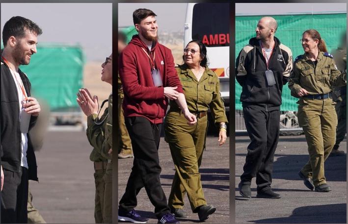 שלושת החטופים שגיא דקל חן סשה טרופנוב ויאיר הורן עברו מידי הצלב האדום לידי צה"ל, כאשר חמאס דאגה לאותה הצגה של במה מושקעת עם שלטי דפוס ענקיים שנושאים את תמונות דיף והישובים היהודים בעוטף עזה, בככר החטופים הישראלים בהלם מהמופע של חמאס ומצד שני שמחים לשחרור השלושה מהשבי.