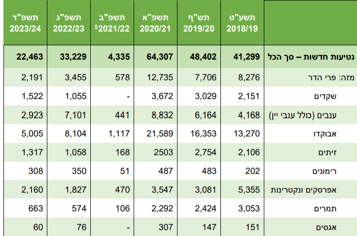 אומדן שטח הנטיעות החדשות של עצי פרי בשנת תשפ"ד (2023/24) הסתכם ב-22,463 דונם, לעומת 33,229 דונם בשנת תשפ"ג (2022/23), ולעומת 4,335 דונם בשנת תשפ"ב (2021/22) שהייתה שנת שמיטה.