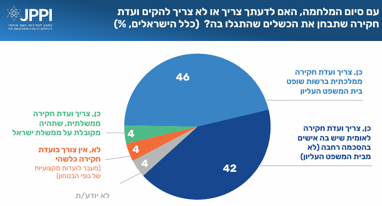 עם סיום המלחמה רוב גדול מאוד (88%) של ישראלים סבורים שיש צורך בוועדת חקירה לבירור נסיבות פריצתה. עם זאת אין הסכמה על אופי ומסגרת הועדה שצריכה לקום: 46% תומכים בהקמת ועדת חקירה ממלכתית בראשות שופט מבית המשפט העליון, ו-42% מעדיפים ועדת חקירה לאומית בהרכב מוסכם, שאין בו ייצוג לבית המשפט העליון.