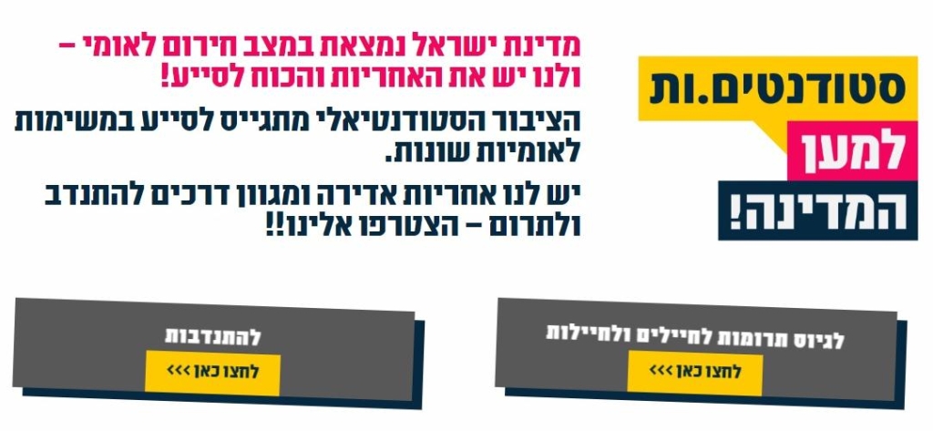 התאחדות הסטודנטים והסטודנטיות הארצית בשיתוף משרדי ממשלה ועמותות חברתיות מובילה מהלך נרחב לטובת חיזוק העורף והחוסן הישראלי ומקימה מטה סיוע המגייס את הציבור הסטודנטיאלי להתנדבות במשימות לאומיות שונות לצד גיוס תרומות לעורף ולצה"ל