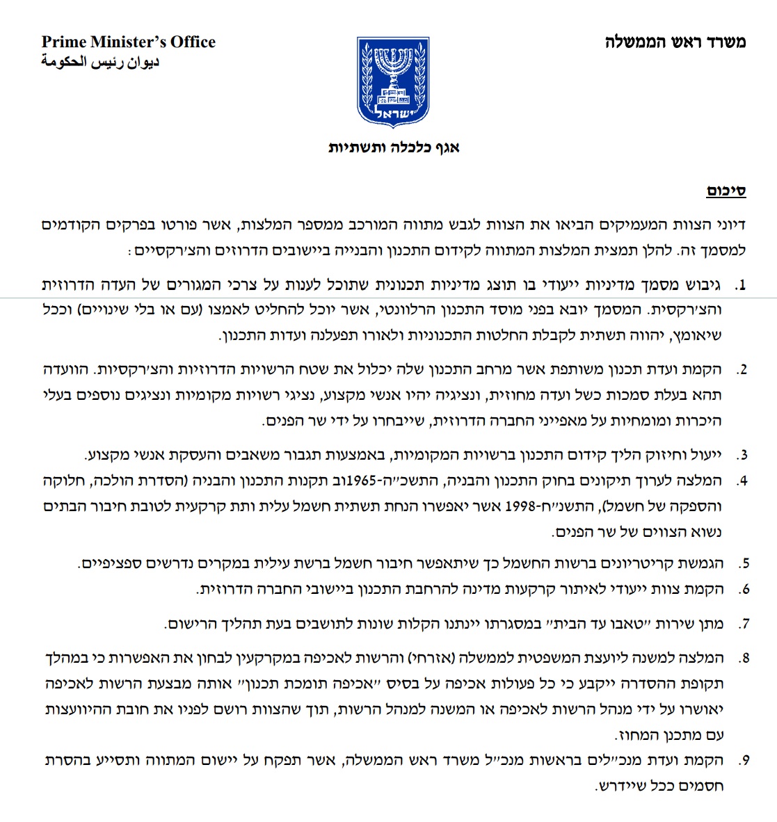המנהל הכללי במשרד ראש הממשלה מבקש לבחון אם עמדה זו יכולה לשמש כעוגן לתקן את פרק משנה 4.5: סימן ב' בני מקום עבור בני העדה הדרוזית, ללא קשר לבני מיעוטים אחרים. מהלך זה יקדם עשרות יחידות דיור ויתן פתרון מיידי לזוגות צעירים, אשר אין להם חלקה או בית להתגורר בו, זה יכול לסייע במיוחד לשני הכפרים דאלית אל כרמל ועוספיה.