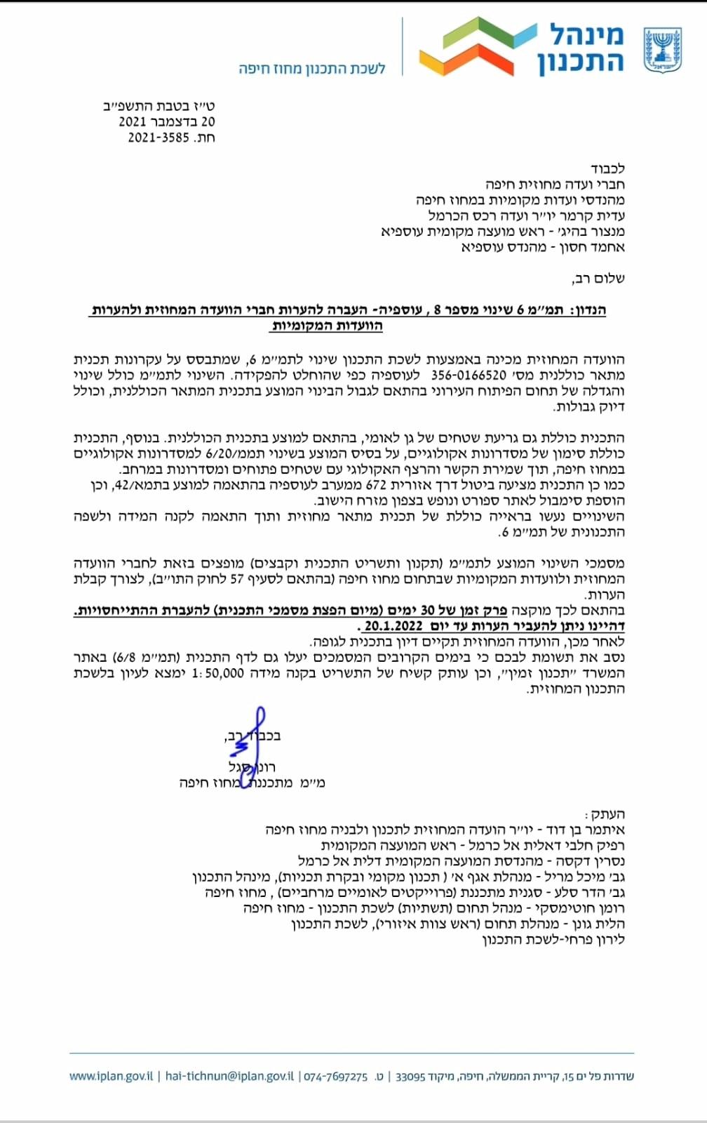 פורטל הכרמל והצפון חושף את מכתבו של מנהל התכנון גונן סגל מ"מ מתכננת מחוז חיפה בהודעתו לבהיג מנסור ולחברי הועדה על כוונתו לשנות את תמ"מ 6, בתכנית מתאר עוספיה מספר 3560166520, צעד חשוב לתכנון בעוספיה לצד ההתנגדות של בעלי האדמות מחוץ לתכנית המוצעת.