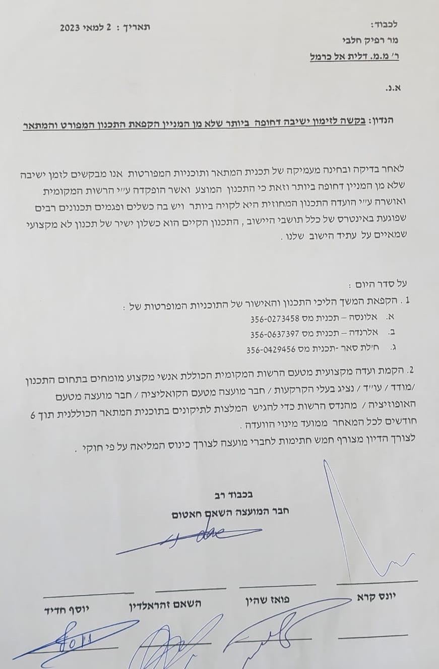 בקשה לזימון ישיבה דחופה ביותר שלא מן המניין, שתדון בעניין הקפאת התכנון המפורט והמתאר בדאלית אל כרמל, חתמו על הבקשה חברי המועצה יונס קרא, פואז שהין, השאם זהר אלדין ויוסף חדיד, הבקשה הופקדה הבוקר בידי מנכ"ל המועצה דאהש חלבי.