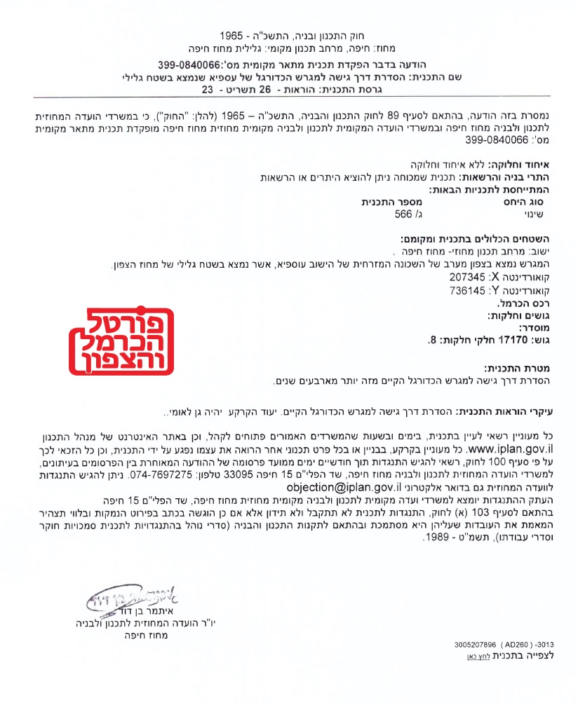 הועדה המחוזית לתכנון ובניה מחוז חיפה מוסרת הודעה בדבר הפקדת תוכנית מתאר מקומית מס' 399-0840066 . שם התוכנית, הסדרת דרך גישה למגרש הכדורגל של עוספיה שנמצא בשטח גלילי של מחוז הצפון בגוש 17170 חלקה 8 .