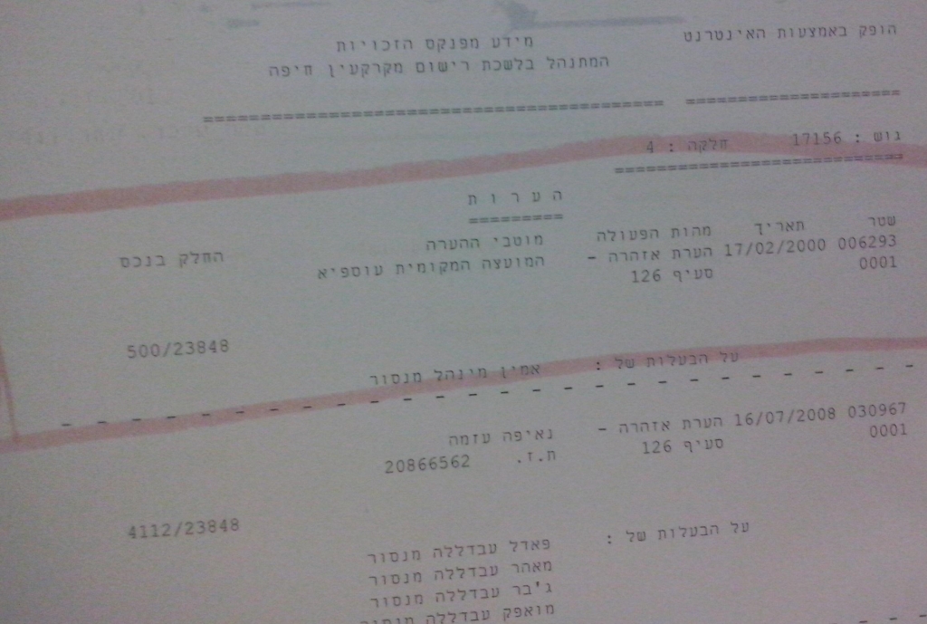 שהתחלנו לברר ולתשאל את המעורבים במקרה, התחילו להתגלות דברים נוספים, על מעמד האדמה שהייתה בבעלותו של המנוח שיך אמין מנסור ז"ל ונרכשה ע"י משפחה מעוספיה, בתאריך 17/2/2000 בזמן כהונתו של ראש המועצה דאז שריף אבו רוכן המועצה המקומית העבירה הערת אזהרה על החלקה.