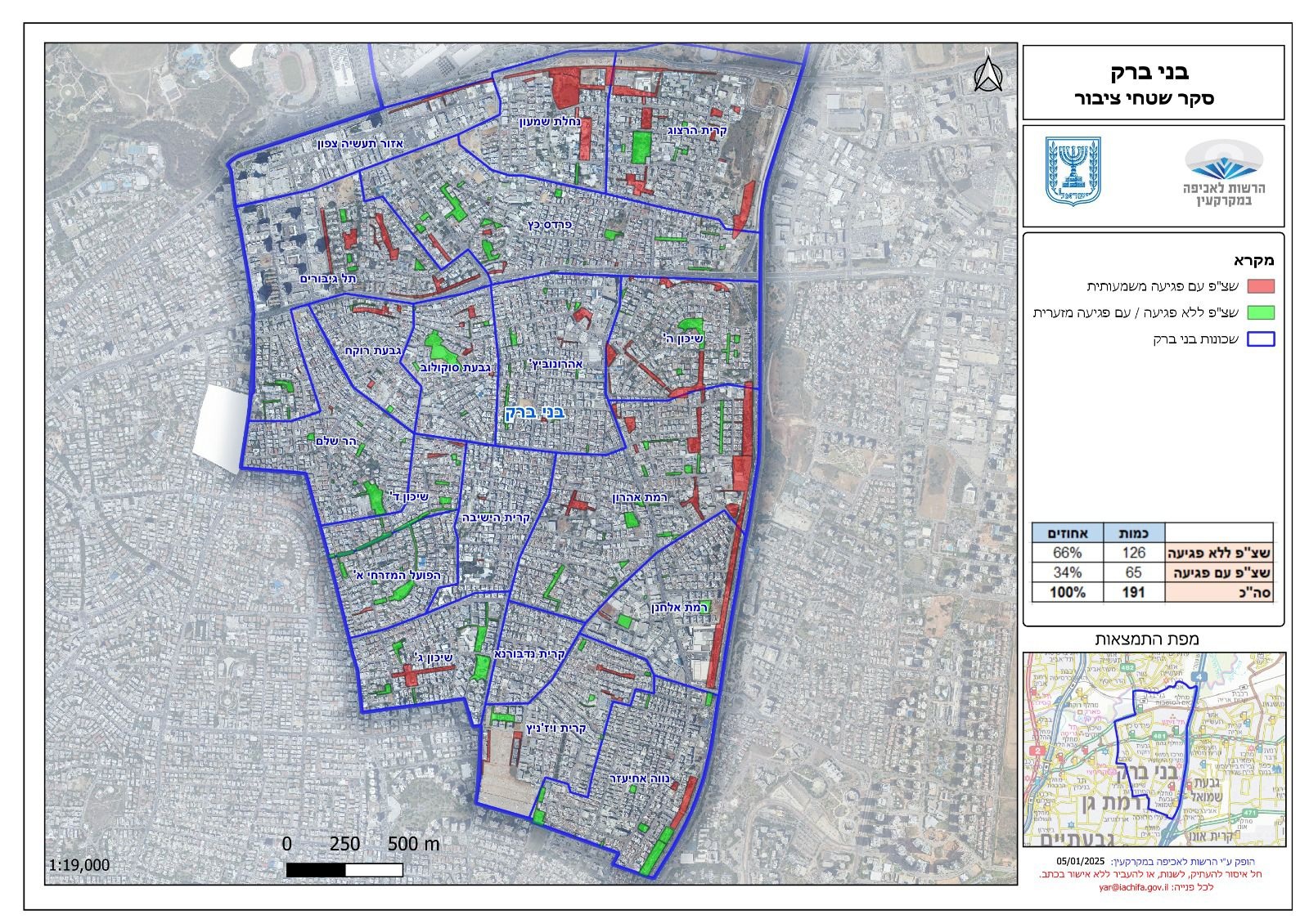 מפת העיר בני ברק, הכוללת מיפוי שטחי הציבור וטבלה המפרטת את העבירות.