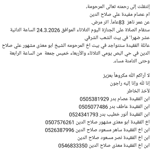 طاقم موقع פורטל הכרמל והצפון يتقدم بأحر التعازي بوفاة المرحومة ام عصام مفيده علي صلاح الدين , من مدينة المغار , والدفن اليوم الثلاثاء الساعة 12.00 ظهراً في بيت الشعب الشرقي , لها الرحمة ولكم من بعدها طول البقاء.