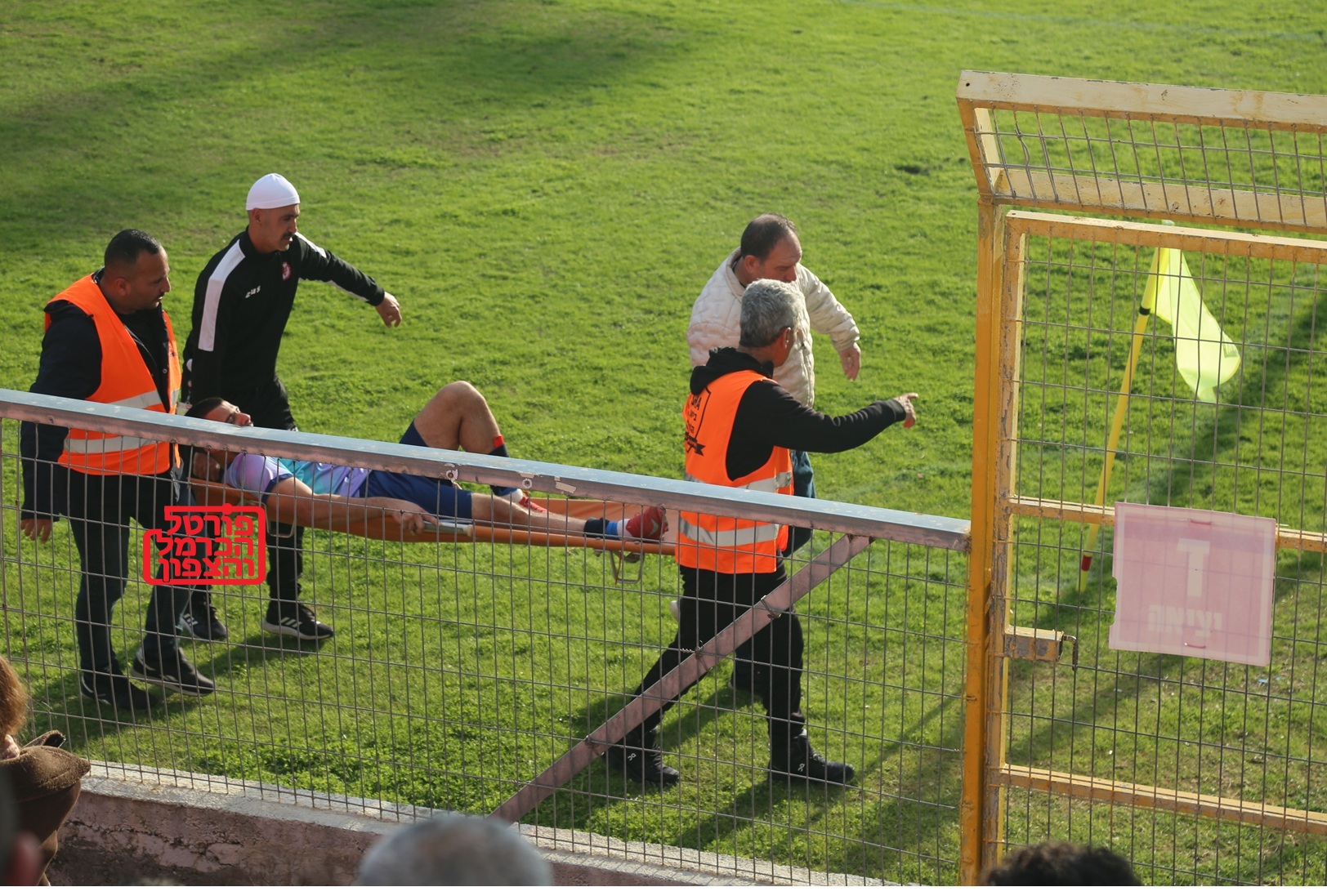 שאדי חלבי חובש המשחק מפנה יחד עם העוזרים שחקן משהד שנפגע ופונה ע"י מד"א לבית חולים